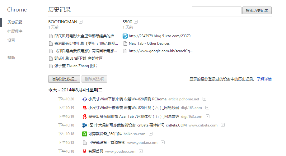 Chrome手机版(笔者用的是Android 4.1,iOS版的未曾试过)一直可以在“其他设备”选项卡中看到登录相同账号的其他电脑或平板、手机同一时间或最后时间打开的网页,现在这个功能在电脑端的Chrome也可以享用了,并且更强大,打开 Chrome 31的历史记录页(chrome://history 或者直接用快捷键 ctrl + h)就可以看到,不仅本机 Chrome 浏览器的历史记录可以看到,同时其他设备的浏览记录也可以看到哦,跟Chrome手机版类似,相同账号的其他设备上Chrome浏览器当前打开的页面都会罗列在此,如果当前没有在其他设备打开Chrome浏览器,则会显示最后一次关闭时所打开的页面,是不是很方便,喜欢这个功能吗?